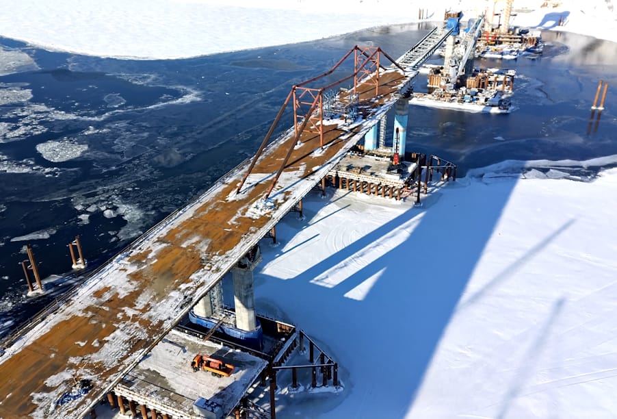 На участке также продолжается укрупненная сборка металлических блоков пролетного строения моста. Надвижка всей металлоконструкции закончится в августе этого года, затем специалисты начнут опускание пролетного строения и приступят к устройству мостового полотна, монтажу искусственного освещения и барьерного ограждения.
